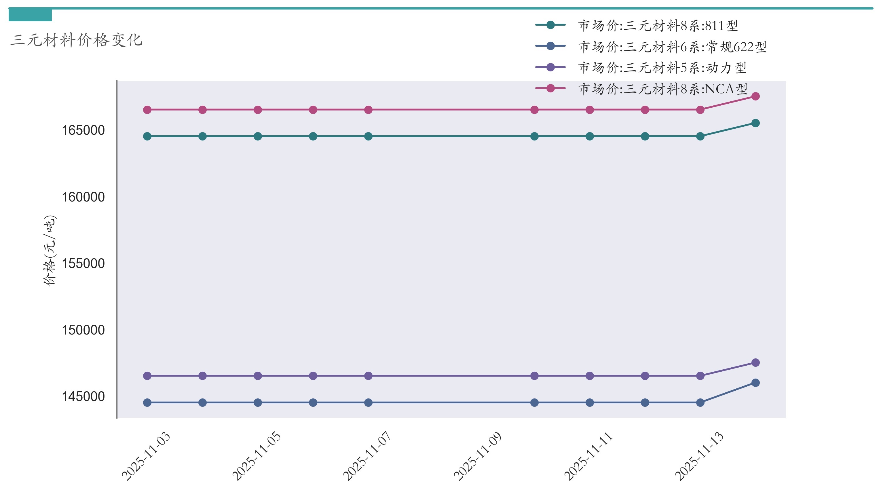截至11月14日,三元材料8系:811型市场报价为165500元/吨,较11月7日上涨1000元/吨。三元材料8系:NCA型市场报价为167500元/吨,较11月7日上涨1000元/吨。三元材料6系:常规622型市场报价为146000元/吨,较11月7日上涨1500元/吨。三元材料5系:动力型市场报价为147500元/吨,较11月7日上涨1000元/吨。近两周三元材料价格变化如下图所示: