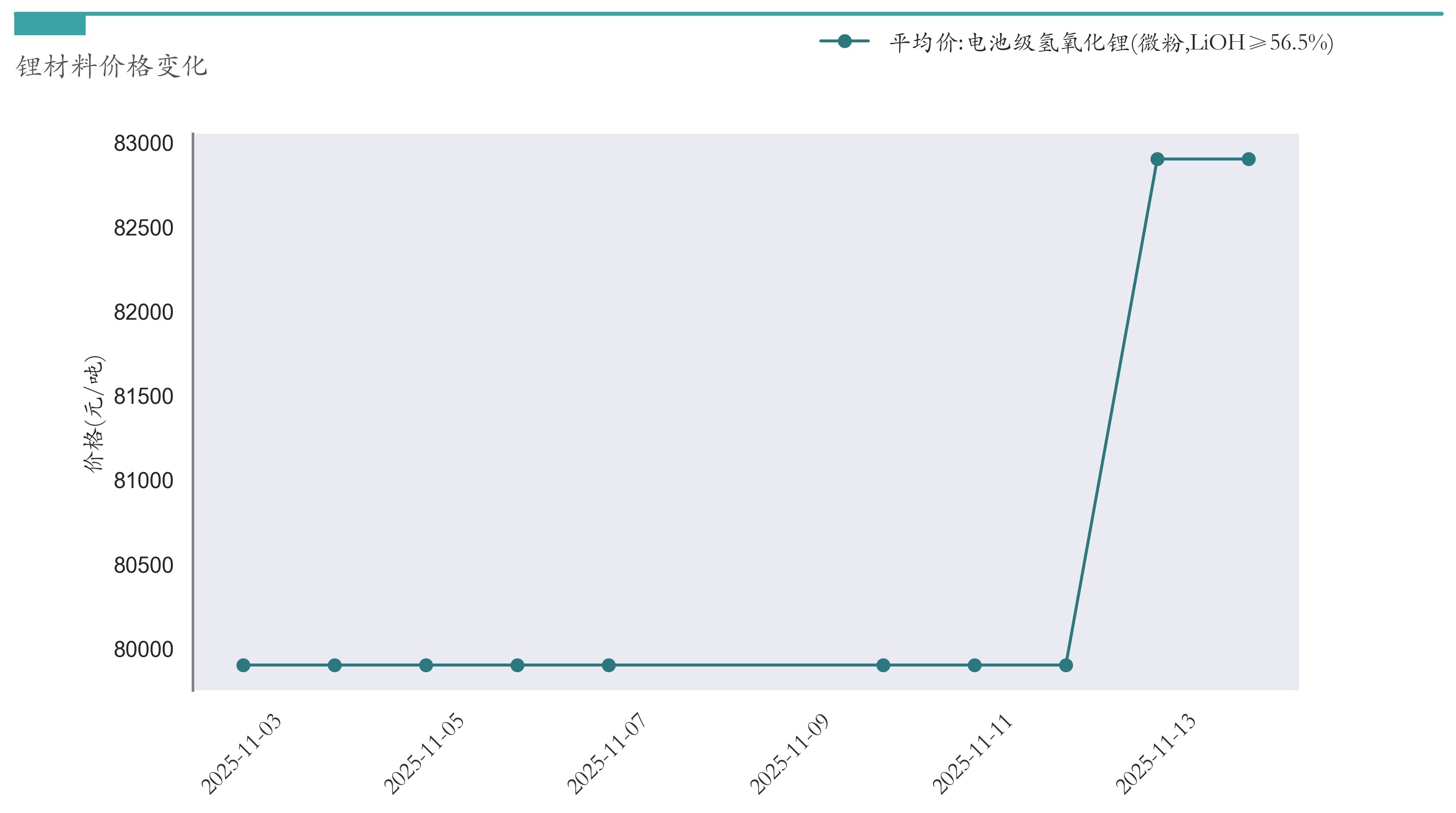 截至11月14日,电池级氢氧化锂平均报价为82900元/吨,较11月7日上涨3000元/吨。近两周氢氧化锂价格变化如下图所示: