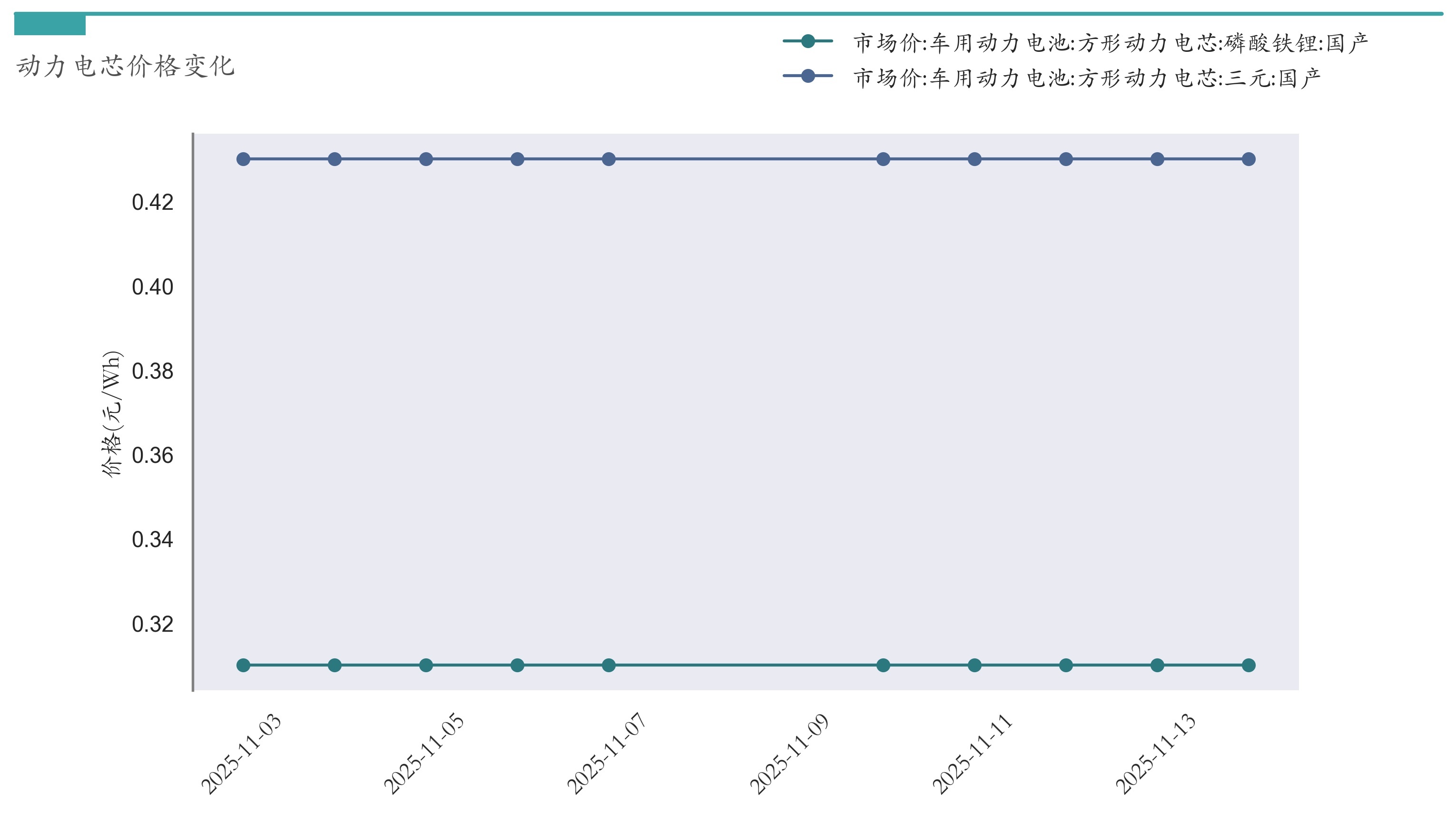 截至11月14日,方形动力电芯(磷酸铁锂)市场报价为0.31元/Wh,较11月7日持平。方形动力电芯(三元)市场报价为0.43元/Wh,较11月7日持平。近两周动力电芯价格变化如下图所示: