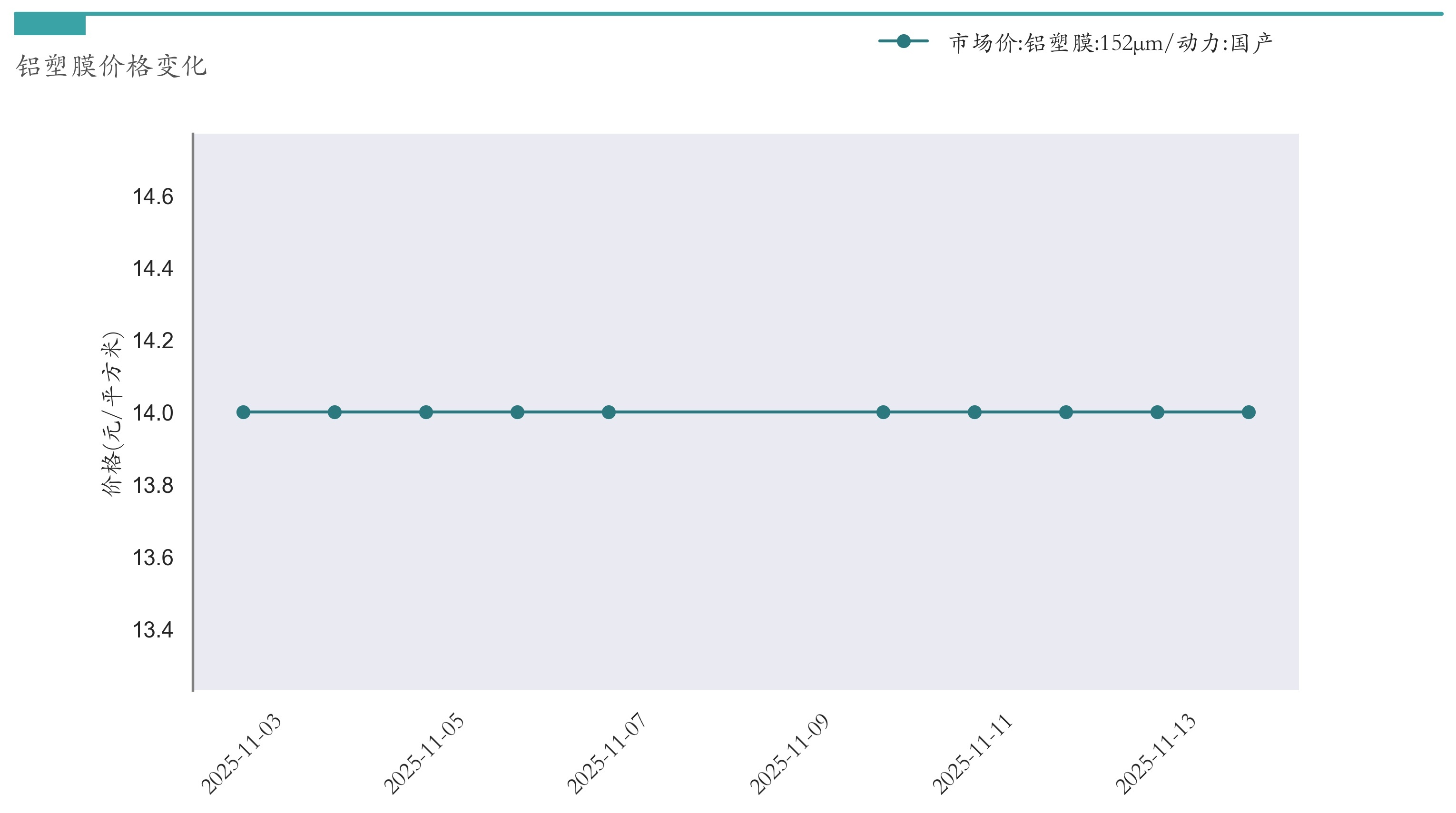 截至11月14日,152μm铝塑膜市场报价为14元/平方米,较11月7日持平。近两周铝塑膜价格变化如下图所示: