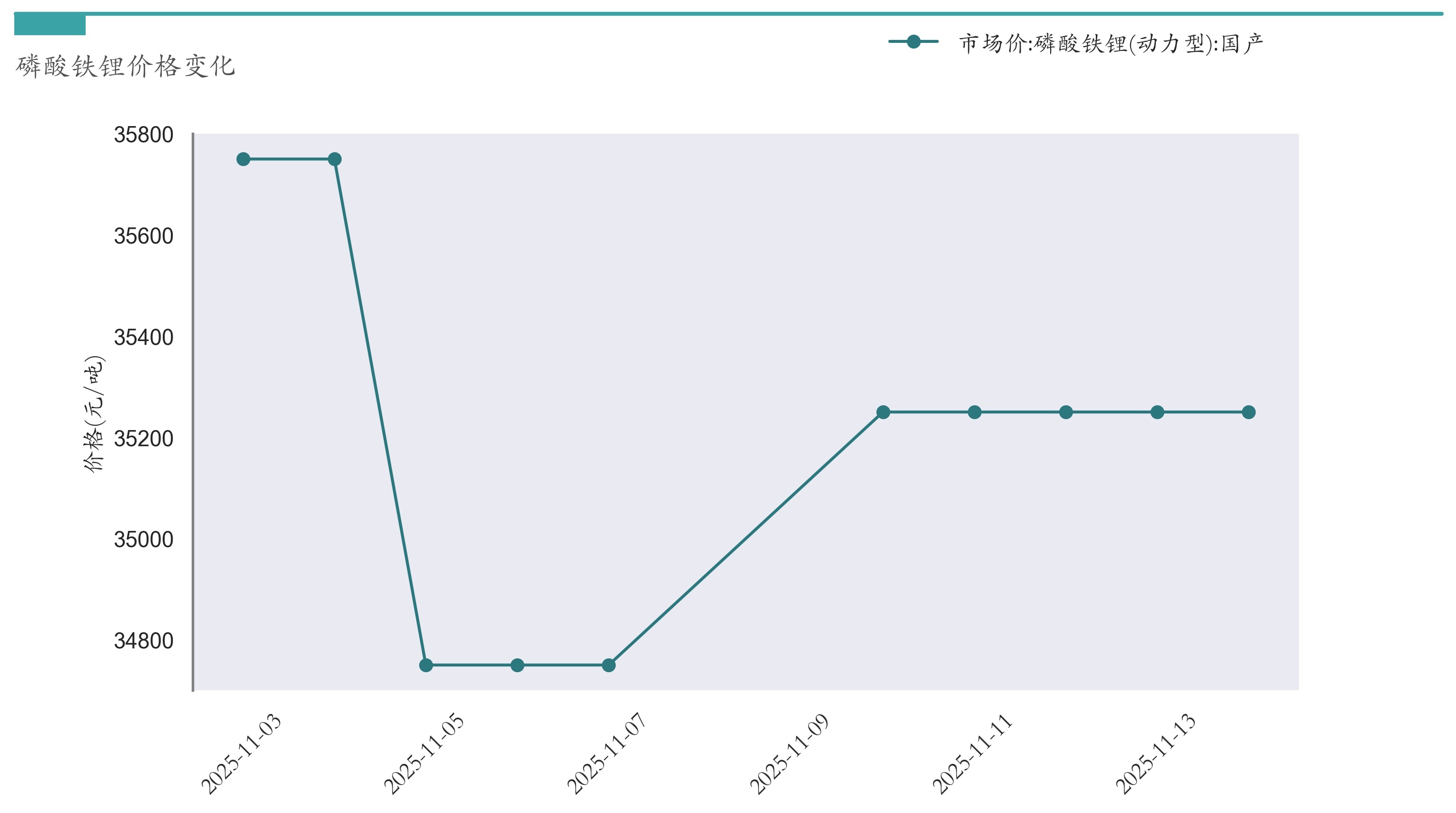 截至11月14日,磷酸铁锂市场报价为35250元/吨,较11月7日上涨500元/吨。近两周磷酸铁锂价格变化如下图所示: