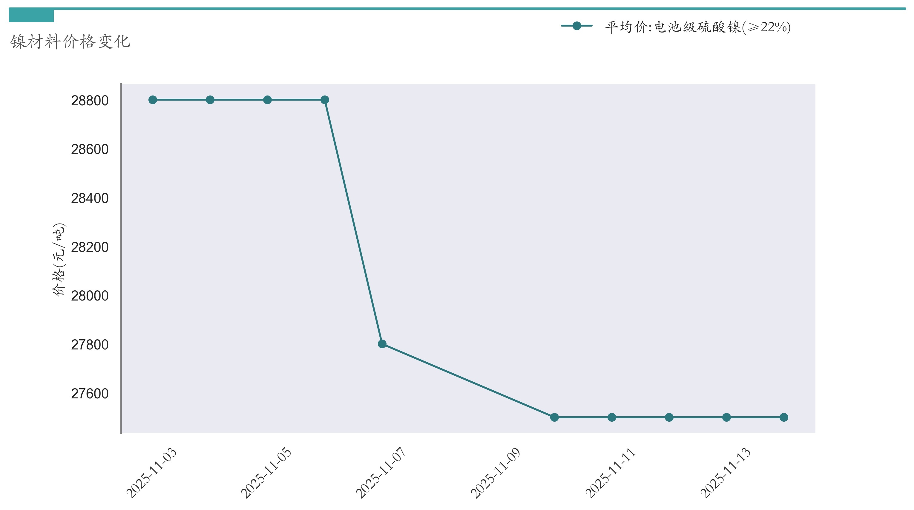 截至11月14日,电池级硫酸镍平均报价为27500元/吨,较11月7日下跌300元/吨。近两周镍材料价格变化如下图所示: