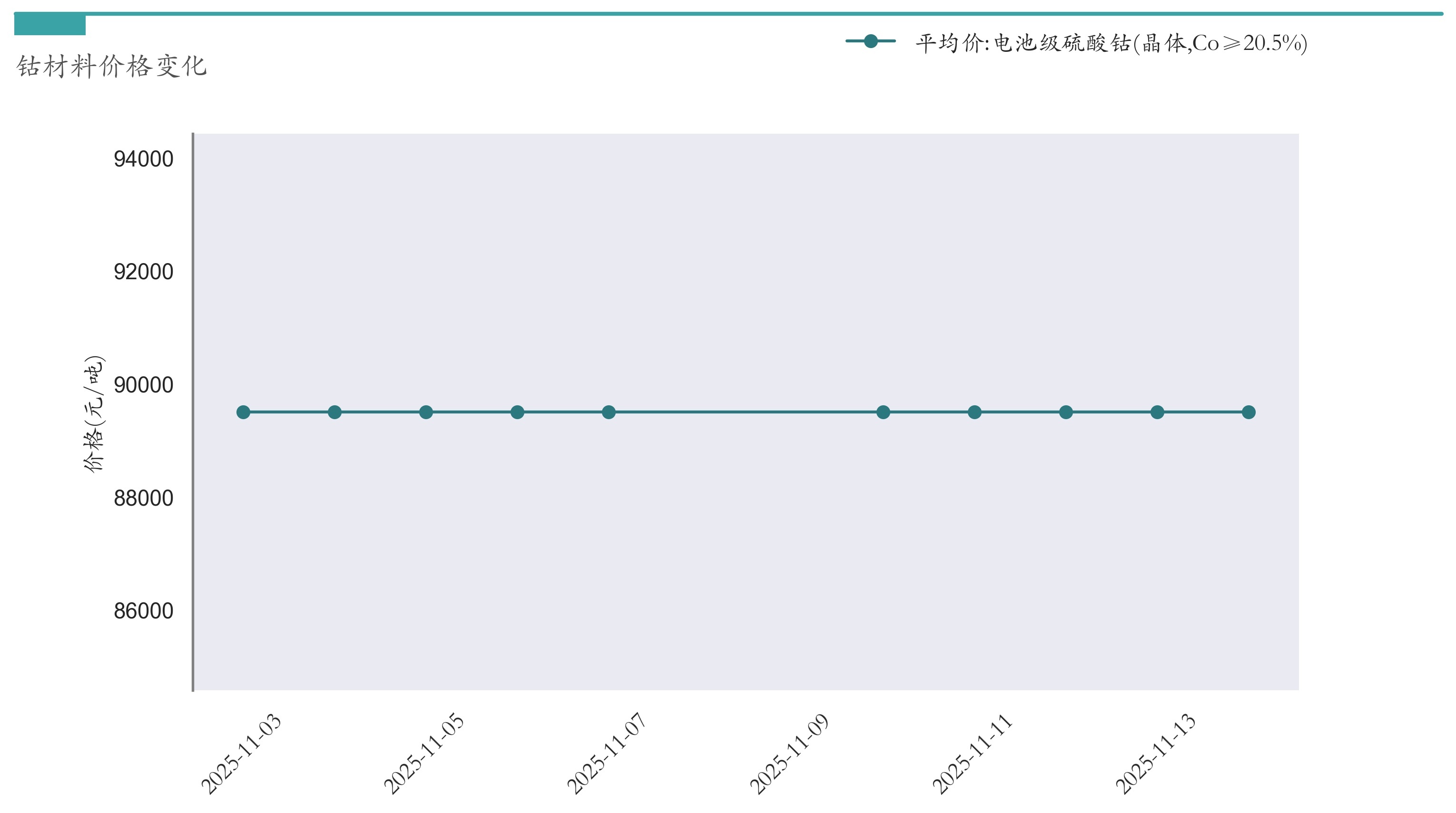 截至11月14日,电池级硫酸钴平均报价为89500元/吨,较11月7日持平。近两周钴材料价格变化如下图所示: