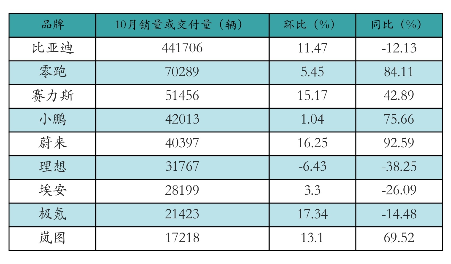 10月新能源车企销量或交付量如下图所示: