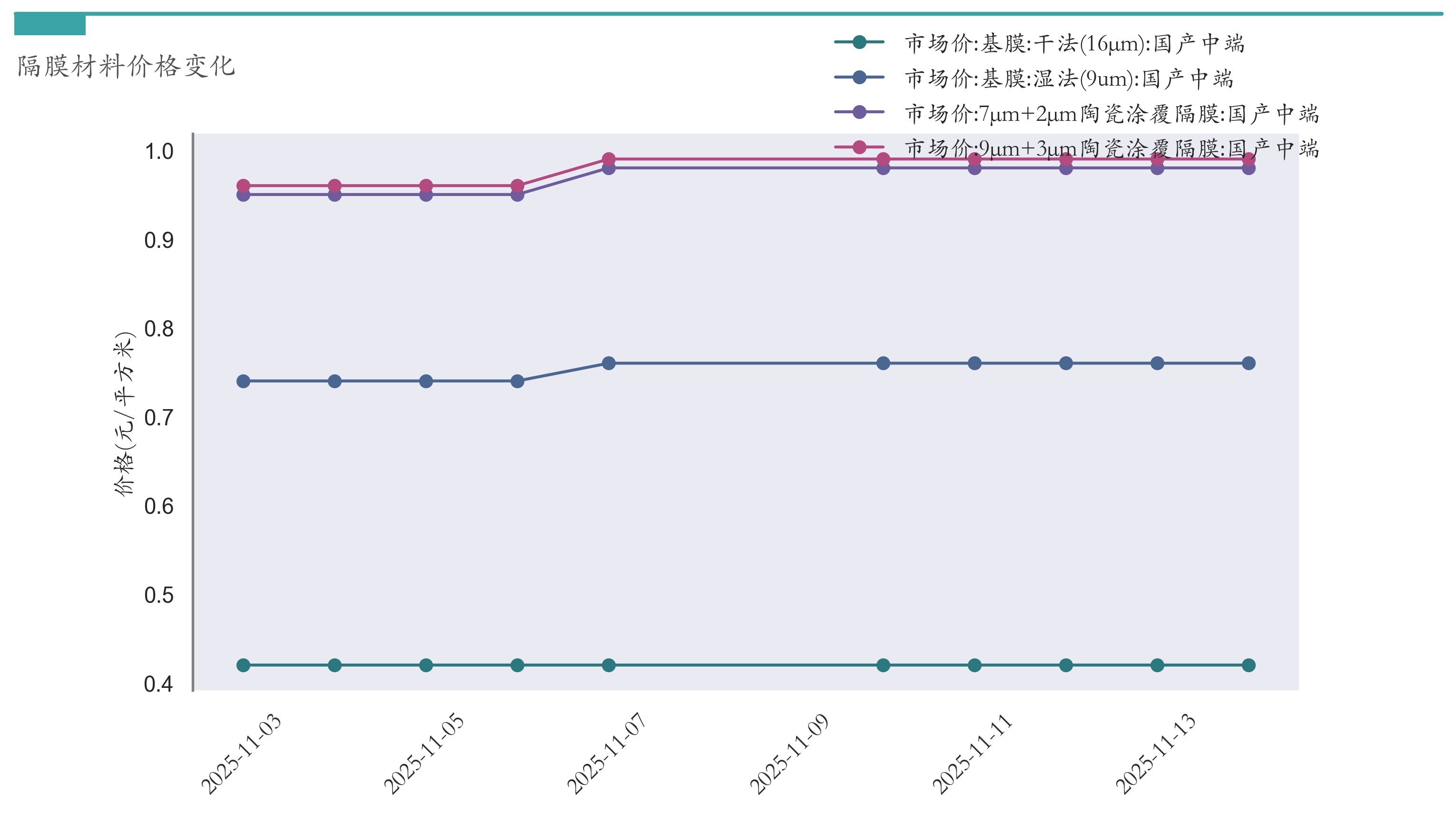 截至11月14日,干法16μm基膜市场报价为0.42元/平方米,较11月7日持平。湿法9um基膜市场报价为0.76元/平方米,较11月7日持平。7μm+2μm陶瓷涂覆隔膜市场报价为0.98元/平方米,较11月7日持平。9μm+3μm陶瓷涂覆隔膜市场报价为0.99元/平方米,较11月7日持平。近两周隔膜材料价格变化如下图所示: