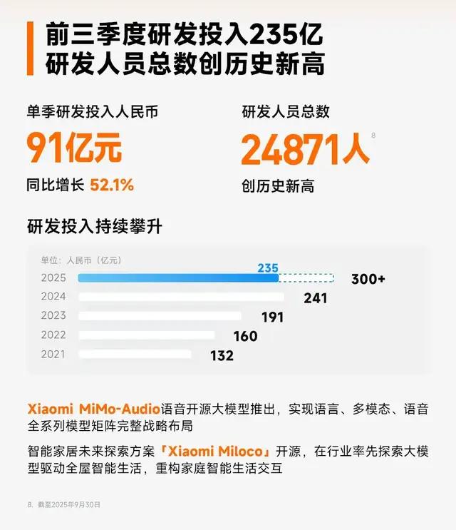 小米三季度业绩公告显示,该季度小米的研发支出为91亿元,同比增长高达52%。今年前三个季度,小米的研发开发则达到了235亿元。小米预计,全年的研发开发将超过300亿元,未来五年累计投入将超过2000亿元。截止到今年9月底,小米的研发人员数量也创下新高,达到了24871人。