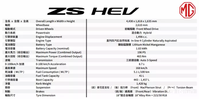 ZS HEV搭载输出功率100kW(136 PS)及扭矩250 Nm的高效马达,马达效率达97.3%,采用液冷系统确保稳定与耐久性。发电机系统则采用高功率密度的“发夹式马达”设计,持续功率45 kW(61.2 PS)及扭矩60 Nm,发电机效率达96.5%。这套系统能同时承担车辆推进、能量回收(再生刹车)及引擎启动、电池充电与辅助动力输出等多项功能。