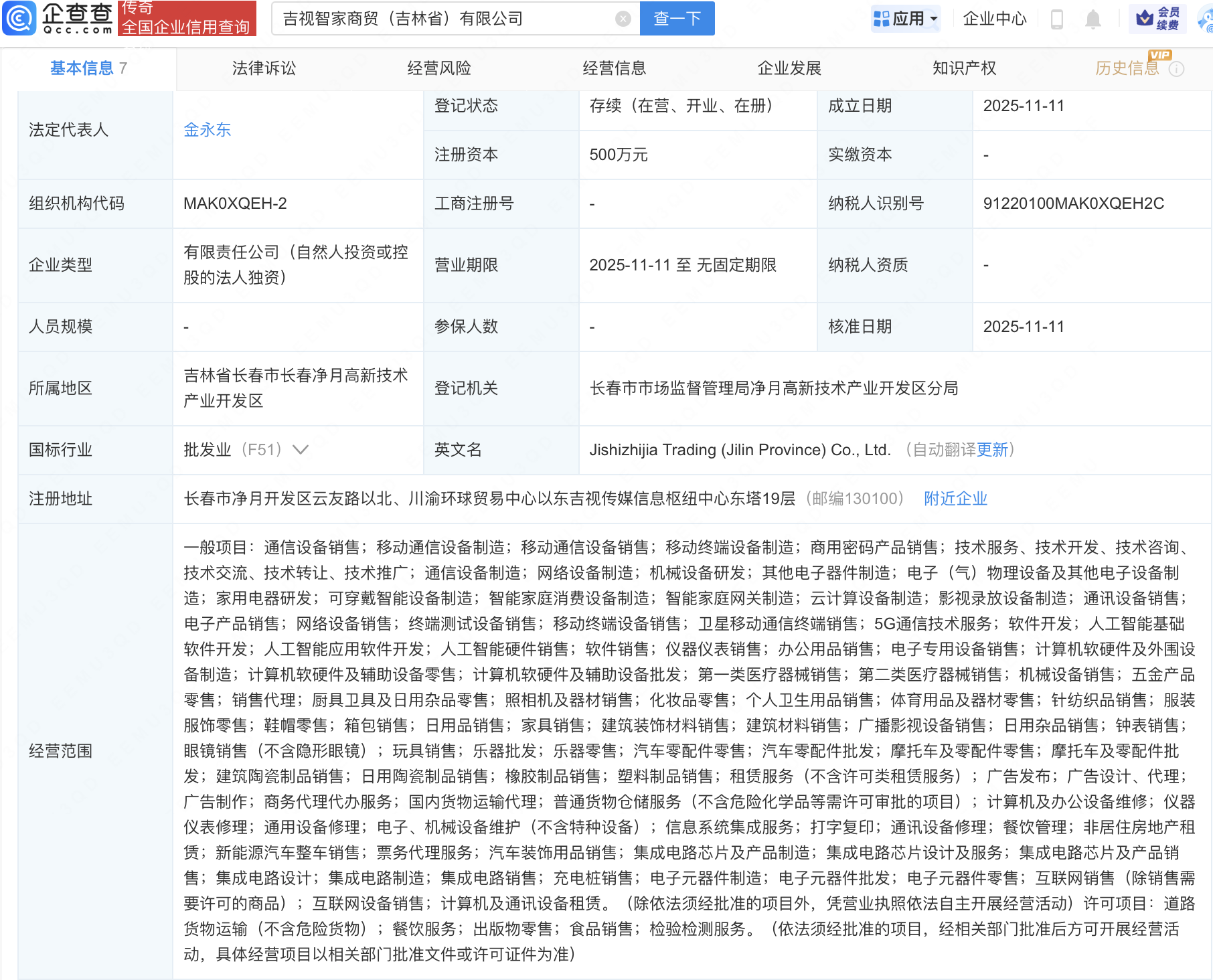 近日,吉视智家商贸(吉林省)有限公司成立,法定代表人为金永东正规配资平台,经营范围包含:人工智能基础软件开发;人工智能应用软件开发;集成电路芯片及产品制造;集成电路设计等。企查查股权穿透显示,该公司由吉视传媒(601929)全资持股。