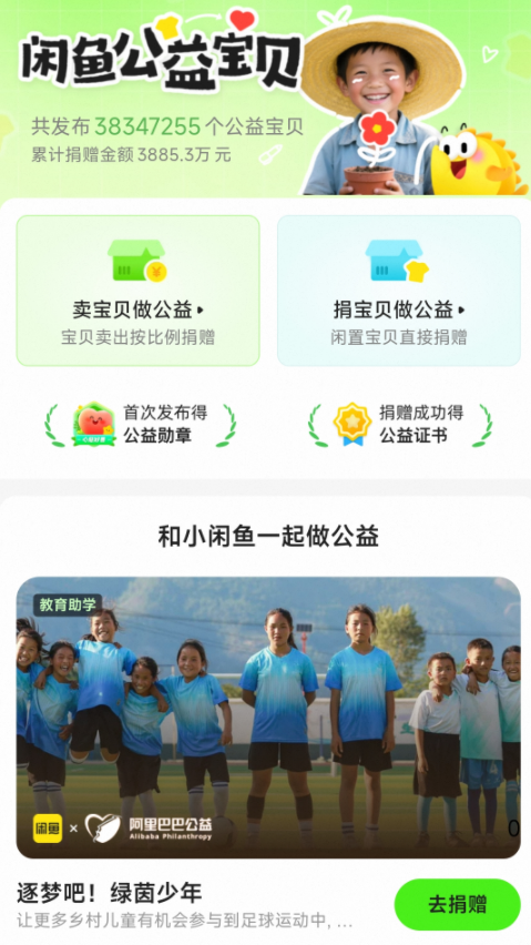“逐梦吧,绿茵少年”项目在阿里巴巴公益平台、闲鱼及众多爱心用户的支持下,于闲鱼公益宝贝专区暖心上线。用户通过闲置交易设置捐赠比例,将旧物价值转化为孩子们脚下的足球与奔跑的力量,预计支持40所乡村学校,让更多孩子圆梦绿茵。