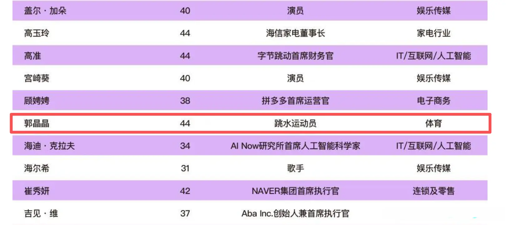 和她同榜的还有刘亦菲、迪丽热巴、贾玲、王濛、张怡宁等社会各界的女性代表。