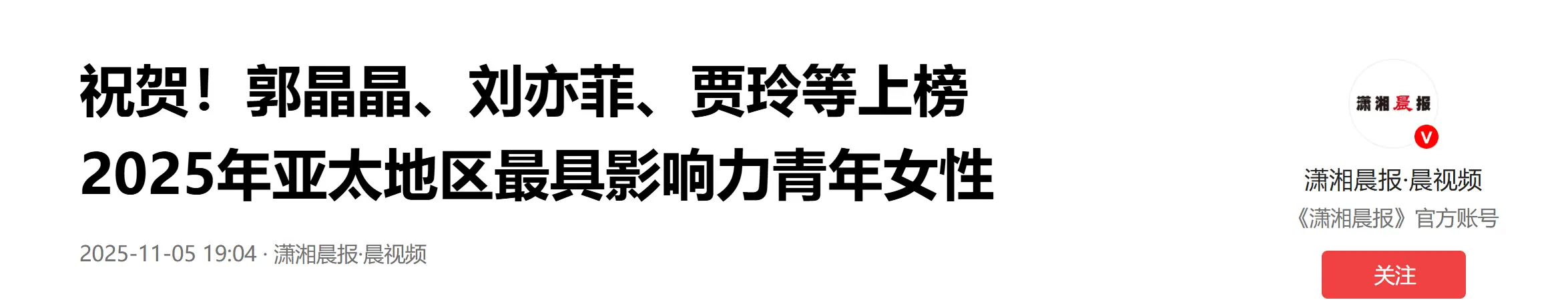 32025年11月,郭晶晶被选入“亚太地区最具影响力青年女性榜单”。